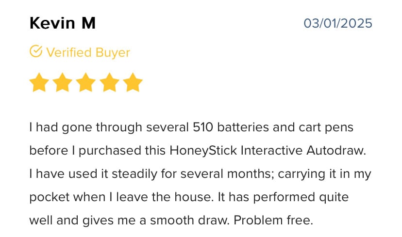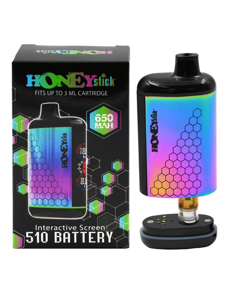 Discover the Honeystick Interactive 510 Battery, a buttonless vape pen with an interactive Hi-Res screen, variable voltage settings, and a 15-second pre-heat function. Fits most 510 thread cartridges up to 3ml. Perfect for a seamless vaping experience.