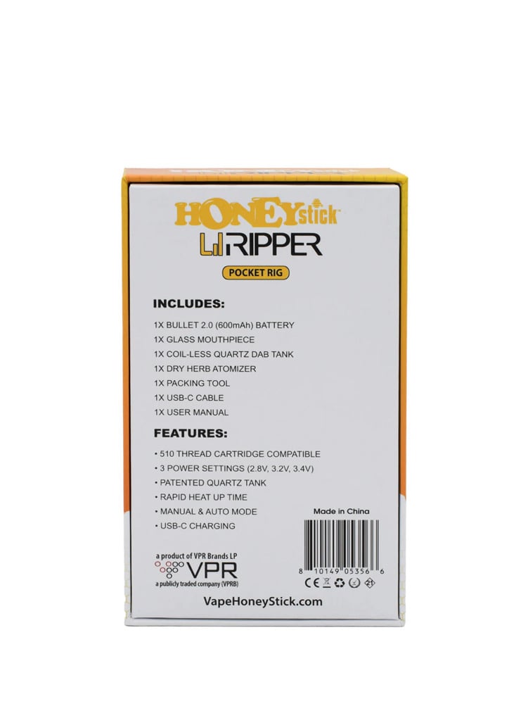 Equipped with a 600mAh battery, USB-C fast charging, and three precision voltage settings (2.8V, 3.2V, 3.4V), the Lil Ripper delivers customizable sessions with the press of a single button. The glass mouthpiece provides superior cooling, enhancing every draw. Plus, with a sleek and ultra-portable design, this electric pocket rig is perfect for on-the-go use, making it the ideal choice for dabbers and dry herb lovers alike. Elevate your vaping game with the HoneyStick Lil Ripper E-Rig – a true game-changer in compact, high-performance vaporization!